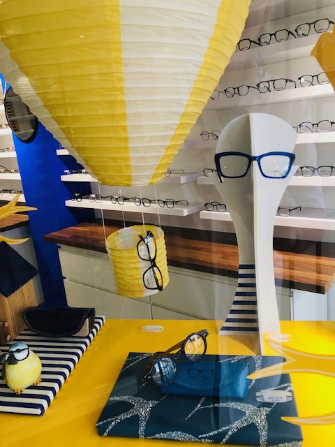 Mise en scène des vitrines sur le thème des Montgolfières, oiseaux en mobile et nids de couleur