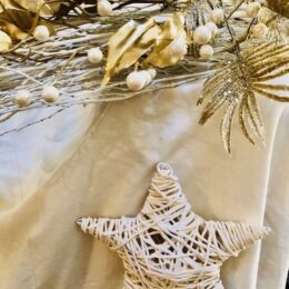 Des cadres en osiers dorés viennent orner les têtes de cerfs en bois blanc que j’ai fabriqué ainsi qu’une composition végétale de branches, de boules, d’étoiles et de feuille dorées qui sont suspendues à côté.